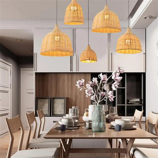 This rattan dining room chandelier fits perfectly into your interior. Superb above a dining room table or in an entryway, this rattan pendant light is full of rustic Chinese style charm