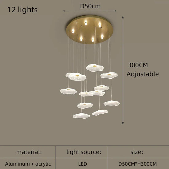 Le lustre nordique en acrylique design créatif pour espaces élégants est bien plus qu'un simple élément fonctionnel dans votre maison. C'est une pièce maîtresse qui incarne le mariage parfait entre modernité et sophistication. Conçu pour s'intégrer harmonieusement dans différents styles d'intérieurs, de la décoration scandinave à l'ambiance industrielle, ce lustre sublime votre espace avec une touche artistique inspirée par la nature, évoquant les feuilles de lotus.