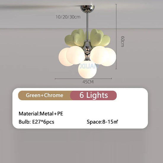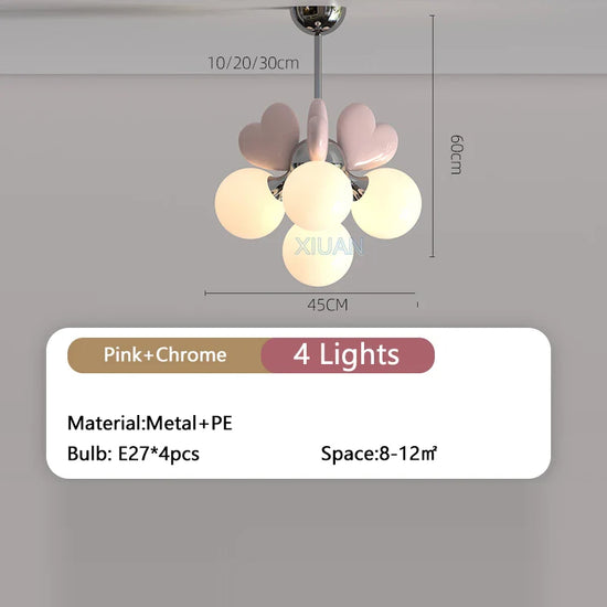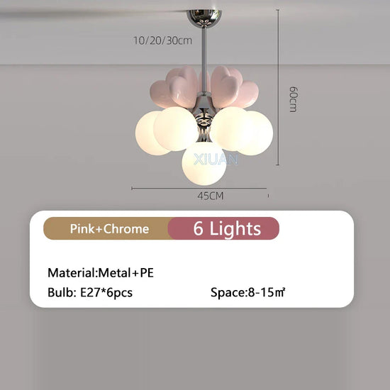 Élevez le décor de la chambre de votre enfant avec notre lustre de princesse avec bulle en forme de cœur pour chambre d'enfant. Conçu avec une esthétique délicate et enchanteuse, ce luminaire unique transforme un espace ordinaire en un véritable royaume digne d'une petite princesse. Le charme de ses bulles colorées en forme de cœur diffuse une lumière douce, permettant de créer un climat chaleureux et serein, parfait pour stimuler l’imagination et le rêve.