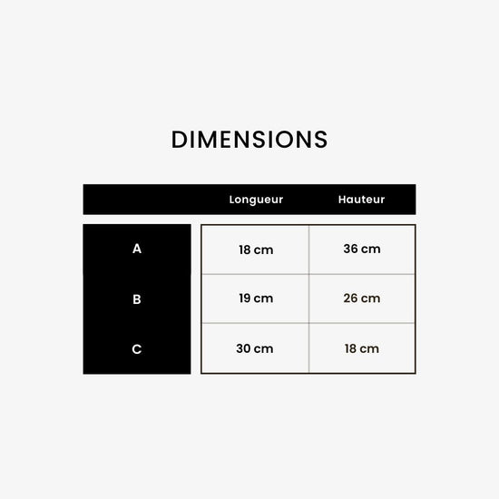 | Dimensions | A: 18 x 36 cm B: 19 x 26 cm C: 30 x 18 cm |